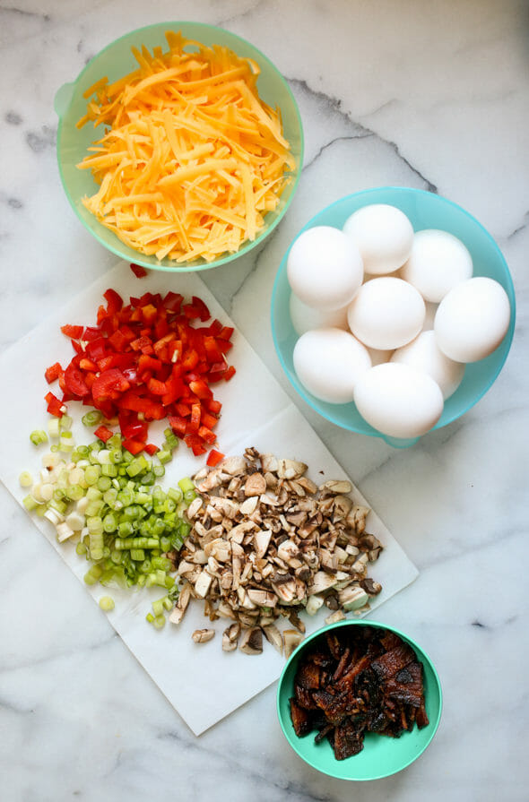 - Toss together the mushrooms, bell pepper, green onions, and bacon. Distribute evenly among the greased muffin tins (it's usually about a small handful in each cup). Evenly distribute the cheese over the veggies and bacon. Pour the eggs over the cups to near the top of the muffin tin. Bake for 15-20 minutes or until cooked through.