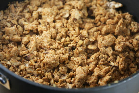 - Brown turkey and mushrooms with spices until cooked through, then add to the slow cooker. What happens is the mushrooms take on the flavors and seasonings of the meat (in this case, cumin, smoked paprika, oregano, chili powder, salt and pepper) and since they cook along with it they just sort of disguise themselves in there. Since they have a soft texture, you don’t really notice them in the final product, but it makes it seems like there’s more meat than there is. In this case, it was more a matter of bulking up the chili and adding secret veggies.