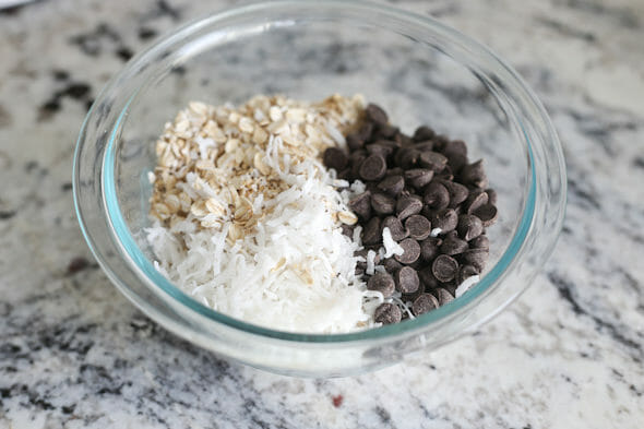 - Stir in dry ingredients, then fold in oats, coconut, and chocolate chips.