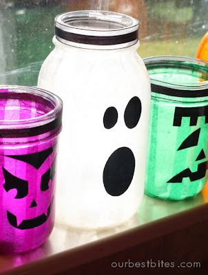 I had the kids making these at our Halloween party tonight, they had a blast! I couldn't find mason jars so we used votive holders and let them just wing it with Halloween tissue paper. They came out really cute!