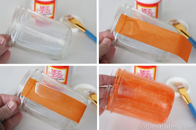 Start by cutting your tissue paper into strips about 1-2 inches wide. Brush a thin layer of mod podge on the glass jar and stick a strip of tissue to it.