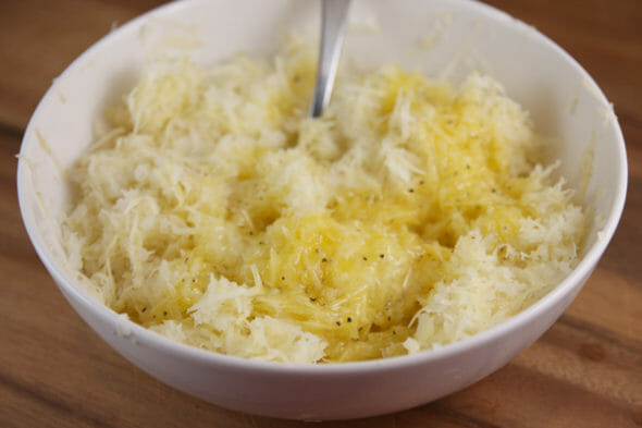 - Drain potato shreds and rinse and dry the bowl that was used and set aside. Place potato shreds and grated onion in the center of a tea towel or several layers of cheese cloth. Twist loose material to secure the bundle, and squeeze firmly to remove excess liquid from the shreds.