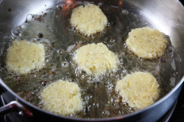 - You’ll want to grab each little ball and squeeze it again in your hand to let any extra moisture drip off again. Then just shape into a little disk and place in a pan of hot oil. You only need about 1/8 inch of oil, so this isn’t a huge deep frying adventure.