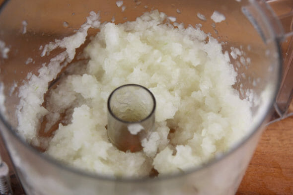 - Peel and shred potatoes using the fine-hole side of a hand grater or food processor. Place in a bowl of cold water and set aside. Meanwhile, shred onion using same fine hole grater, or pulse in food processor until very finely chopped.