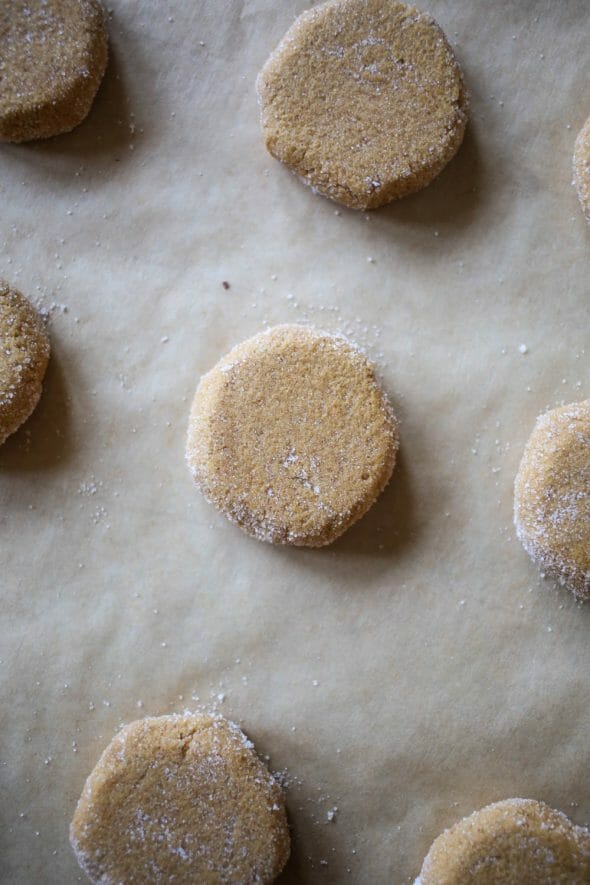 - Using a standard-sized cookie scoop, scoop the dough and then roll the dough ball in sugar. Then place it on baking sheets. Repeat with the remaining dough. If desired, you can use a flat-bottomed cup or mug to gently press them down.