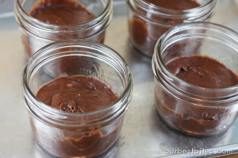 Place the mason jars on a cookie sheet. Divide the mixture evenly among the 8 jars (no need for greasing the jars) or 12 cupcake liners if you’re going that route. The jars should be about half full or a little less. Bake until a toothpick inserted into the center of the jar comes out with only a few moist crumbs attached 22-25 minutes. Remove from oven and carefully (with a pot-holder!) transfer jars to a cooling rack. Let jars cool till at least close to room temperature before topping with ganache.