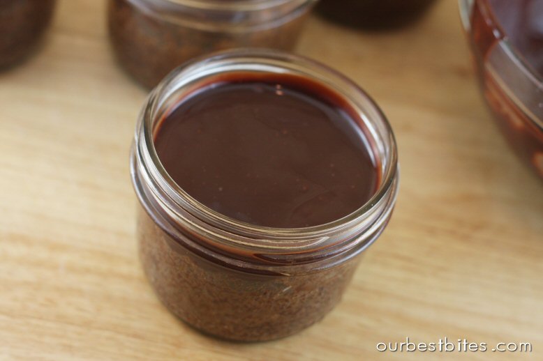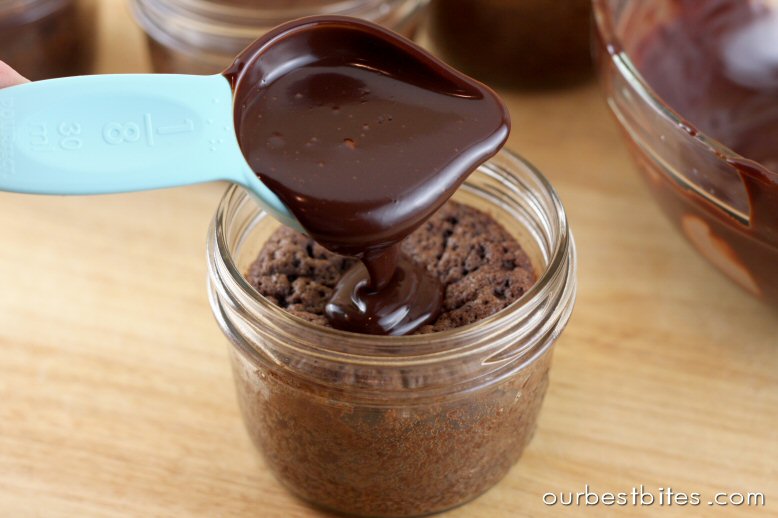 To assemble, pour 1 1/2-2 Tbs ganache over the top of each cupcake jar. If desired, use a paring knife to first hollow out a well in the middle of the cake. Tilt jars to distribute ganache evenly over the top of the cake and then let cool for the ganache to set. If storing overnight, place lids and rings on jars and leave at room temperature.