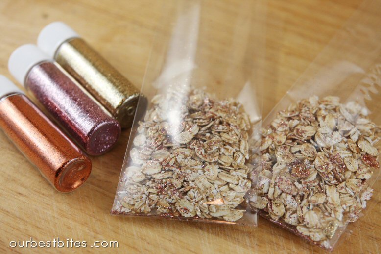 So fun! We started doing this last year with glitter, and this year it was colored sugar- I gave each girl an old spice jar with a bit of sugar in it, and we put a drop or two of food coloring in and they shook it like mad, then dumped in some oats. They shake their jars a few times a day, they're pretty excited to dump them out tomorrow!!