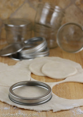 Roll out a small handful of dough. This is just for the tops of your pies, so eyeball about that much. Grab the ring part of your jar and use that as your cookie cutter. Brilliant, right? Cut out the tops and set aside.