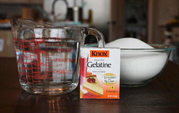 - Start by sprinkling some unflavored gelatin over cold water. It will instantly take form as the granules of gelatin absorb the water. After it softens, add boiling water to dissolve it and you’ll have a liquid. Once the gelatin is mixed in and dissolved, add the sugar.
