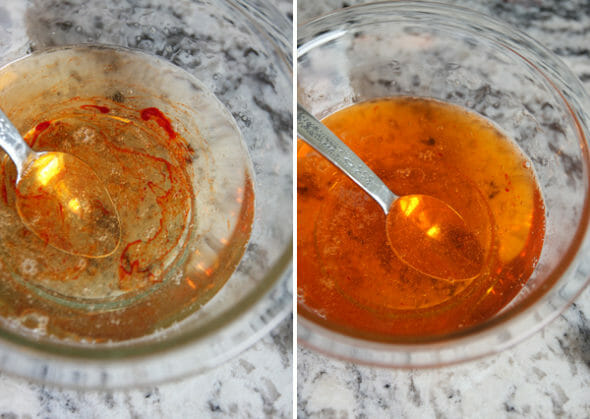 - Transfer to a heat-proof bowl and add your flavoring and food coloring (if you’re only making one variety, feel free to mix these in right in the pan the mixture is already in). I used oils and started with about 1/8 teaspoon per cup of sugar mixture, and increased to taste from there. I’m using oils, but regular extracts will work fine too. If you can find oil, they work particularly well in things like this because you don’t run the risk of having an alcohol-ish after taste from extract. The mixture should be cool enough to test by this point so you can go by taste. When you’re satisfied with your mixture, transfer it to a container lined with plastic wrap and non-stick spray.